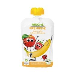 Mousse biologica di banana, mela, fragola e lampone, senza zuccheri aggiunti, senza glutine, dal 6° mese 100 g – Freche Freunde