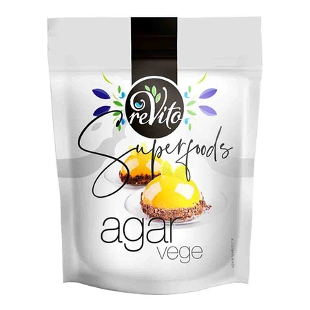 Agar reVito è un agente gelificante ottenuto dalle alghe marine. Mescolato con un liquido, l'agar gelifica e addensa, trovando applicazione nella produzione di gelatine vegetali, budini e dessert. Rappresenta la migliore alternativa vegana alla gelatina animale. L'agar non ha sapore, non ha odore ed è facile da usare. Il suo ingrediente principale è il galattosio, uno zucchero complesso non digeribile dall'uomo. Funziona benissimo come additivo per le creme, come addensante per le zuppe e come base per le gelatine di frutta. L'Agar non ha bisogno di essere raffreddato in frigorifero, poiché gelifica già a temperatura ambiente.