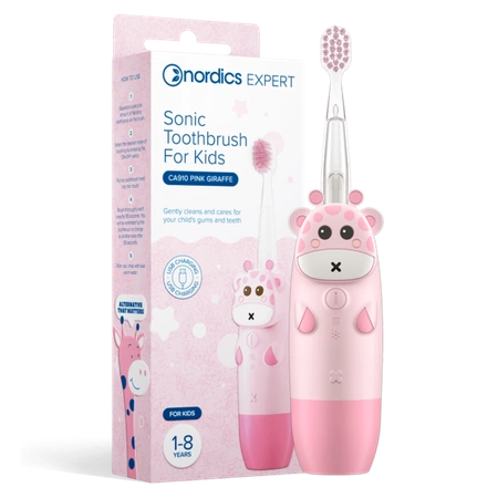 Nordics Expert presenta l'innovativo spazzolino sonico ricaricabile Ca910 per bambini in un adorabile colore rosa con motivo a giraffa. Questo spazzolino è stato progettato appositamente per i più piccoli, offrendo quattro modalità di spazzolamento adatte alle diverse fasce d'età e una divertente luce LED per incoraggiare i bambini a prendersi cura regolarmente della propria igiene orale.