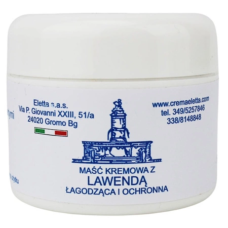 L'unguento in crema ELETTA alla lavanda è un prodotto naturale, realizzato a mano nell'Alto Serio. Creato con passione sulla base di 20 anni di ricerca, l'unguento è ideale per chi ha la pelle sensibile e arrossata. L'unguento è efficace per alleviare le irritazioni derivanti da scottature, calli, unghie incarnite, cicatrici, cicatrici e punture di insetti. È utile anche per il cambio dei neonati, per alleviare il bruciore e ammorbidire la pelle dopo la rasatura, per favorire il trattamento delle emorroidi e per decongestionare le vie respiratorie e l'inalazione.
