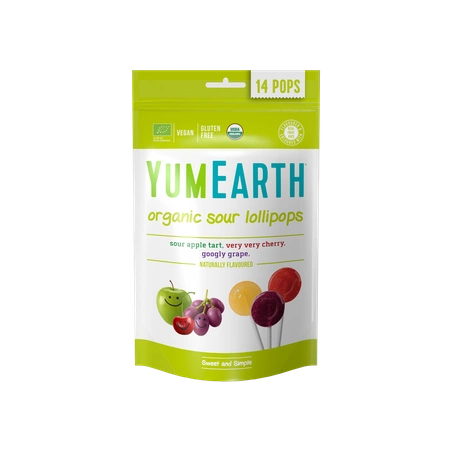 I lecca-lecca di frutta biologici ai gusti di mela, ciliegia e uva sono integratori alimentari. I lecca-lecca sono un prodotto biologico, non OGM, senza glutine, senza noci, senza uova, senza latte, senza soia e senza grano. Chi soffre di allergie alimentari e pensava di dover dire addio ai dolci non deve più affliggersi. Yum Earth offre un alimento che è per lo più, se non completamente, privo di allergeni alimentari. Ci sono 84 mg (105% RWS) di Vitamina C in 4 lecca-lecca.
