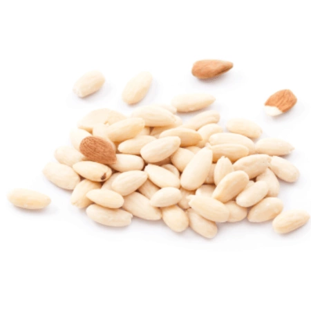Le mandorle sbollentate sono mandorle a cui è stata tolta la pelle immergendole brevemente in acqua calda, ottenendo così una superficie liscia e brillante. Sono una ricca fonte di proteine, fibre, vitamine e minerali, tra cui vitamina E, magnesio e zinco, che favoriscono una dieta sana e la vitalità del corpo. Sono ideali da consumare come spuntino, per guarnire insalate, muesli o prodotti da forno, aggiungendo una consistenza croccante e un delicato sapore di mandorla ai piatti.