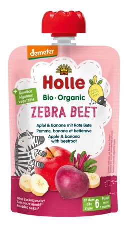 La mousse zebrata alla barbabietola in tubetto (mela - banana - barbabietola) di Holle è un prodotto alimentare di alta qualità per bambini a partire dai 6 mesi di età. Realizzato con ingredienti certificati provenienti da agricoltura biodinamica e biologica, senza zuccheri aggiunti, offre una dolcezza naturale e una ricchezza di valori nutrizionali. Confezionata in atmosfera protettiva per preservarne la freschezza e la qualità. La mousse è un ottimo modo per aggiungere varietà alla dieta del bambino.
