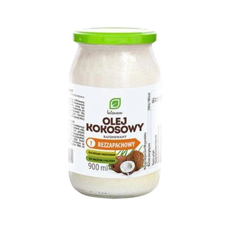 Olio di cocco raffinato non profumato, marchio Intenson. Si ottiene dalla polpa delle noci della palma da cocco. L'olio di cocco è inodore e insapore. È resistente alle alte temperature e al processo di irrancidimento. Il punto di fumo dell'olio di cocco è di 178 gradi C. È caratterizzato da un elevato contenuto di acidi grassi MCT a catena media. Uno di questi è l'acido laurico, che ha effetti antibatterici, antimicotici e antivirali.