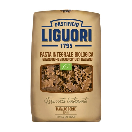 La pasta biologica Integrale Mafalde Corte di Liguori è un prodotto BIO di alta qualità che viene prodotto in Italia utilizzando una ricetta tradizionale. La linea di pasta Integrale è realizzata con acqua di sorgente cristallina e farina di grano duro integrale proveniente da coltivazioni biologiche certificate. Questo tipo di pasta è ricco di fibre, che hanno un effetto benefico sul sistema digestivo. Un'altra caratteristica unica dei prodotti di questa marca è il metodo di essiccazione lenta a basse temperature, che preserva le proprietà nutritive e il sapore naturale della pasta fatta in casa. La pasta Liguori è confezionata in packaging di carta riciclabile, poiché la cura dell'ambiente e il rispetto per la natura sono una priorità per l'azienda. La forma piccola e leggermente ondulata della pasta Integrale Mafalde Corte si abbina perfettamente alle salse a base di pomodoro condite con capperi e olive.