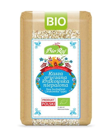 La semola di grano saraceno biologica krakowska si ottiene dai semi di grano saraceno non tostati, decorticati e tritati. Ha un sapore dolce e delicato. Viene utilizzato soprattutto come aggiunta a zuppe, piatti unici, paté, cotolette, paste di pane, oltre che come ingrediente per la cena in combinazione con verdure o stufati.