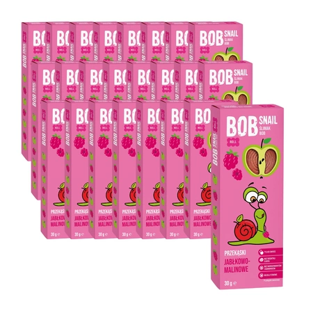 Bob Snail mela e lampone sono snack alla frutta naturali del produttore Eco-Snack. Sono realizzati con frutta e nient'altro! I prodotti Bob Snail non contengono conservanti, coloranti o zuccheri aggiunti. I prodotti Bob Snail sono adatti ai vegani. Lo snack di mele e lamponi è composto al 100% da mele e lamponi. Le mele sono una fonte di preziosa fibra alimentare, che migliora il tratto digestivo. Stimola la peristalsi intestinale e previene il cancro al colon. Inoltre, le mele contengono acido ursolico, minerali (potassio, magnesio, ferro, silicio e calcio), quercetina e i semi contengono vitamina B17. I lamponi sono una ricca fonte di polifenoli, tra cui predominano gli ellagotannini e gli antociani. Inoltre, contengono acidi organici, tra cui acidi fenolici e flavonoli