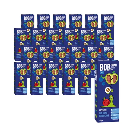Bob Snail mela e mirtillo sono snack alla frutta naturali del produttore Eco-Snack. Sono realizzati con frutta e nient'altro! Nei prodotti Bob Snail non ci sono conservanti, coloranti e zuccheri aggiunti. I prodotti Bob Snail sono adatti ai vegani. Lo snack di mele e mirtilli è composto al 100% da mele e mirtilli. Le mele sono una fonte di preziosa fibra alimentare, che migliora il tratto digestivo. Stimola la peristalsi intestinale e previene il cancro al colon. Inoltre, le mele contengono acido ursolico, minerali (potassio, magnesio, ferro, silicio e calcio), quercetina e i semi contengono vitamina B17. I mirtilli devono il loro colore blu alle antocianine, pigmenti con proprietà antiossidanti. Contengono acidi organici, tannini e flavonoidi.