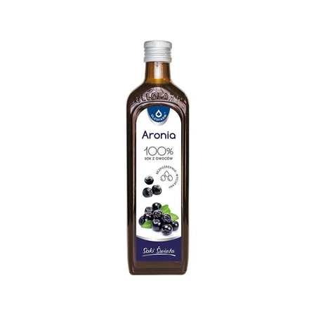 Succo di aronia di Oleofarm. L'aronia (Aronia melanocarpa L.) è un arbusto appartenente alla famiglia delle rose, coltivato per i suoi frutti aromatici di colore blu scuro. Il succo spremuto direttamente dal frutto dell'aronia è caratterizzato da un sapore aspro e leggermente aspro. È un ottimo integratore per una dieta quotidiana equilibrata. Può essere consumato da persone di tutte le età. È particolarmente consigliato durante la stagione autunno-inverno e il solstizio di primavera