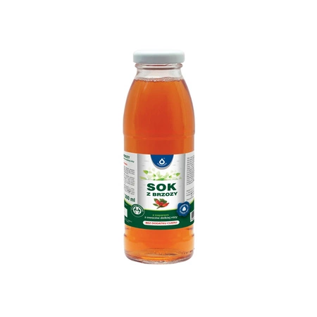 La linfa di betulla Oleofarm si ottiene all'inizio della primavera dai tronchi degli alberi di betulla e viene raccolta nel periodo che va dalla comparsa delle prime gemme sull'albero fino allo sviluppo delle foglie. È caratterizzata da un colore paglierino chiaro e da un gusto neutro e delicato. L'aggiunta di infuso di rosa canina gli conferisce un gusto delicato e un caratteristico colore ambrato. Il succo di bacche di betulla è un'eccellente aggiunta alla dieta quotidiana e può essere consumato da persone di tutte le età, compresi i bambini, senza restrizioni quantitative. Vale la pena berlo soprattutto durante il periodo autunno-inverno e il solstizio di primavera, perché rafforza l'immunità e aiuta a combattere i virus. Il succo contiene vitamina C, flavonoidi con proprietà antiossidanti (tannino, acido clorogenico), calcio, magnesio, sodio e potassio.