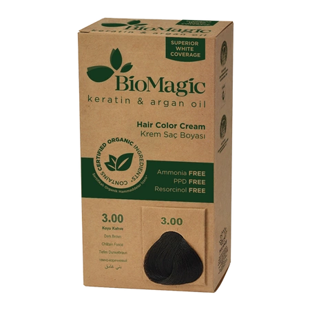 L'intero kit di colorazione Biomagic nella tonalità marrone scuro (3.00) contiene 250 g di prodotto, che consente un unico utilizzo su capelli di media lunghezza.