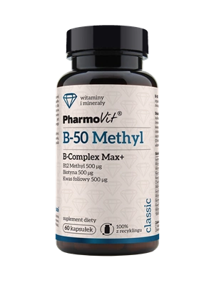 B-50 Methyl B-Complex Max+ - integratore alimentare contiene un complesso di vitamine B attive che favoriscono il corretto funzionamento del sistema nervoso, il metabolismo energetico e il mantenimento della salute mentale. La formula aiuta a ridurre la sensazione di stanchezza e affaticamento, supporta le funzioni cognitive e partecipa alla produzione di globuli rossi.