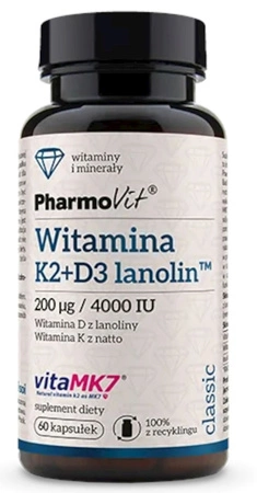 Vitamin K2 + D3 lanolin™ di Pharmovit è un integratore alimentare contenente vitamine K e D in dosi elevate. La vitamina K è ottenuta dal natto, attraverso un processo di biofermentazione con Bacillus subtilis natto. Questa forma, il menachinone-7 (MK-7), è caratterizzata da un'elevata biodisponibilità ed efficacia.